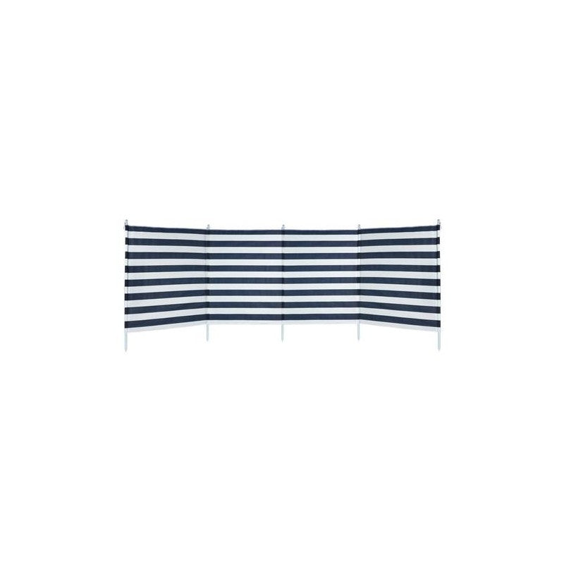 Το Αντιανεμικό Φράγμα Παραλίας προσφέρει ισχυρή προστασία από τον αέρα και την άμμο σε παραλίες και εξωτερικούς χώρους. Διαθέτει τέσσερα τμήματα με ρυθμιζόμενους ξύλινους στύλους και ύφασμα με μπλε ρίγες.