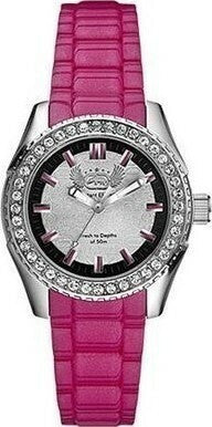 Διαθέτει ασημί καντράν με το χαρακτηριστικό λογότυπο κορώνης της Marc Ecko, θήκη από ανοξείδωτο ατσάλι και ροζ λουράκι από σιλικόνη.